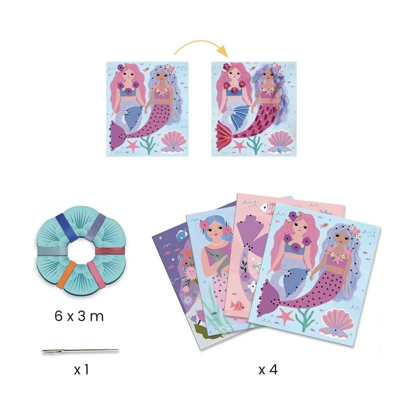 Ce kit propose d’embellir 4 cartes illustrées à l’aide de rubans satinés et d’organza. À l’aide de l’aiguille à bout rond, l’enfant glisse les rubans dans les cartes perforées puis les travaille en torsades, bouclettes et petits nœuds qui apportent relief et brillance aux illustrations. • Des cartes préperforées pour faciliter l’activité. • 2 types de rubans pour varier les effets : satin et organza. • Différentes techniques pour travailler les rubans : lignes simples, nœuds, torsades ou bouclettes. • 1 aiguille à bout rond pour ne pas se blesser. • 1 livret explicatif détaille l’activité pas à pas.