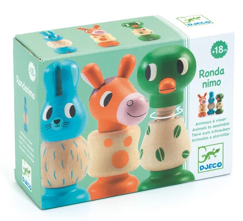 3 animaux en bois à visser et dévisser pour développer la dextérité des tout-petits.