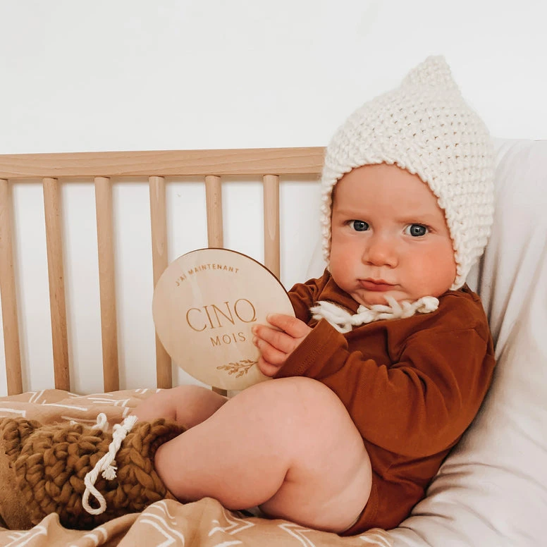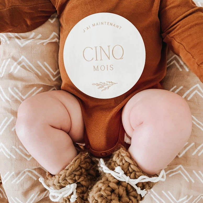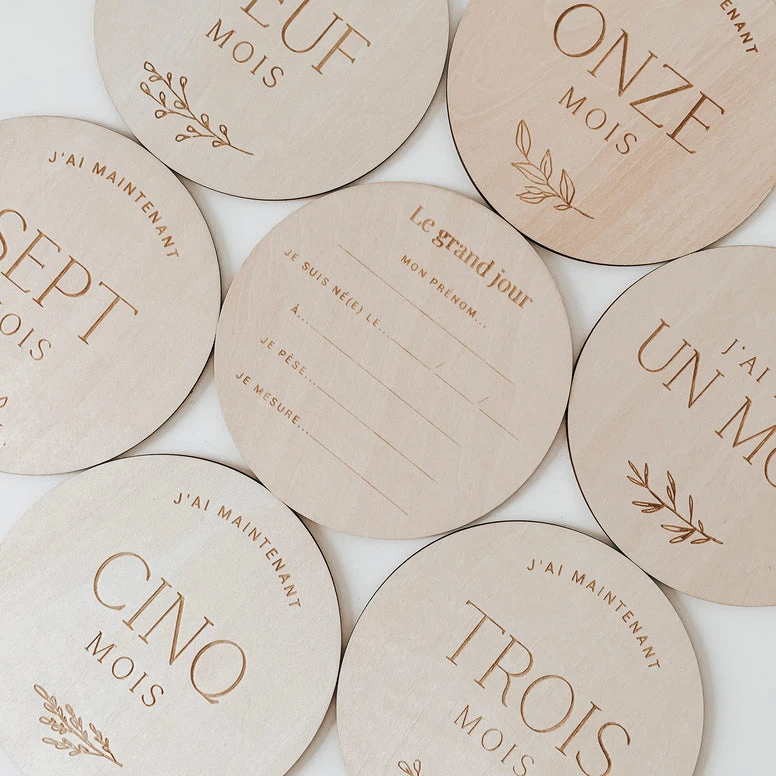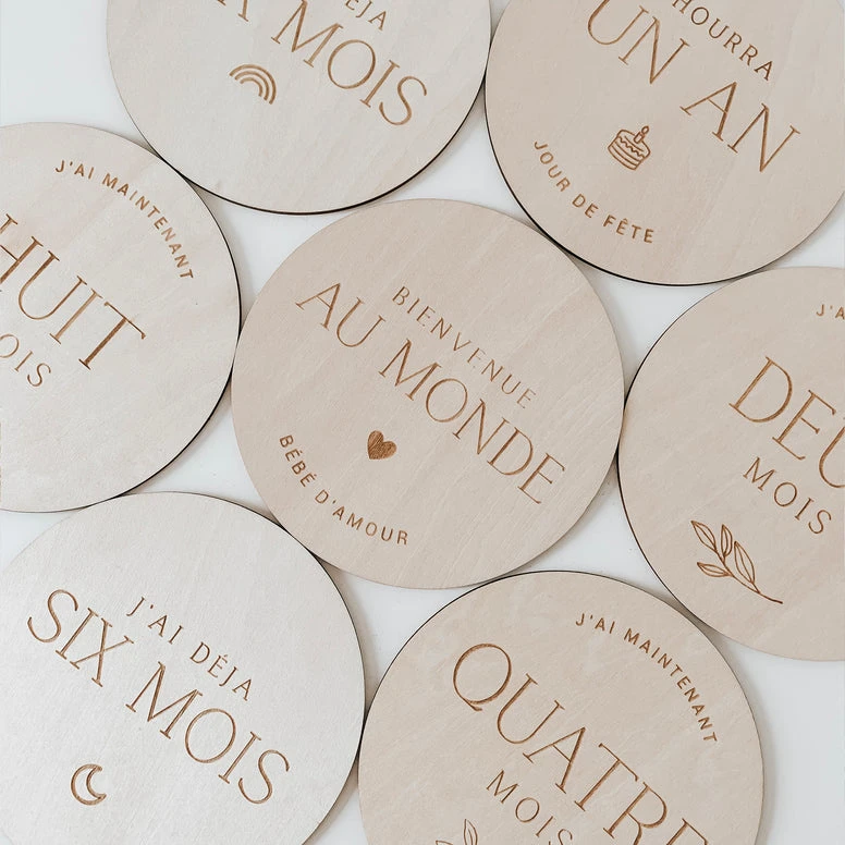 Un petit ensemble de 7 jolies pastilles recto/verso de bois naturel. Amusez-vous à photographier et à suivre l’évolution de la grossesse ou les premiers mois de bébé. Vous pouvez inscrire les informations de naissance de bébé au dos de la première pastille et ensuite la conserver pour décorer sa petite chambre ou la mettre dans son album de naissance.