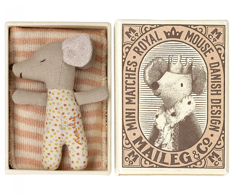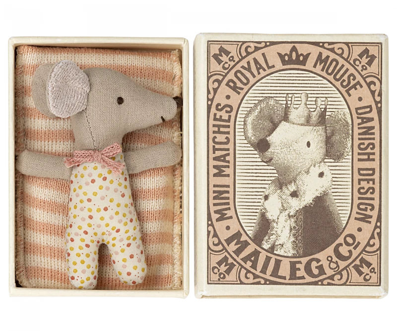 Un élément classique Maileg. Cette souris est prête pour des heures de jeu et dort serré dans la petite boîte d’allumettes. Les vêtements et le linge de lit sont faits de tissus doux avec des impressions uniques et de belles couleurs.