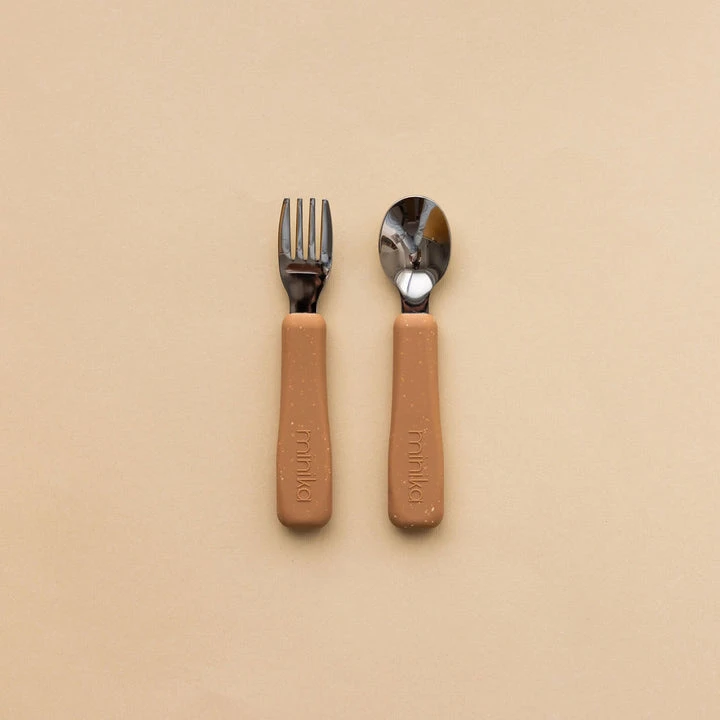 Ensemble de fourchette et cuillère avec poignée en silicone. Silicone alimentaire sans BPA, PVC, phtalates et sans plomb. Laver avec du savon et un chiffon mouillé ou au lave-vaisselle. Acier inoxydable. Poignée en silicone anti-dérapante.