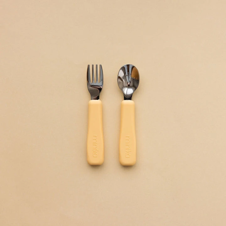 Ensemble de fourchette et cuillère avec poignée en silicone. Silicone alimentaire sans BPA, PVC, phtalates et sans plomb. Laver avec du savon et un chiffon mouillé ou au lave-vaisselle. Acier inoxydable. Poignée en silicone anti-dérapante.
