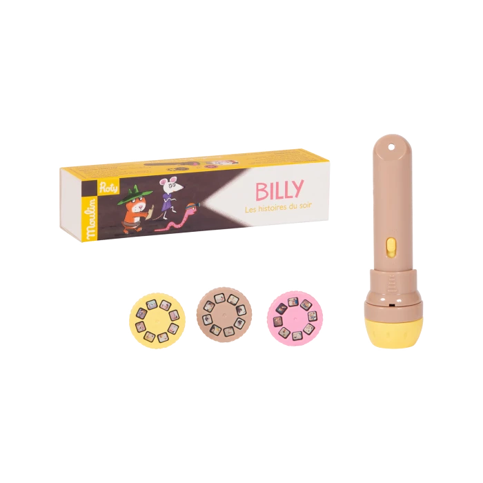 Lampe torche de poche où chacun des 3 disques projetés sur le mur raconte les aventures de Billy, le hamster cow- boy, héros de l’école des loisirs. Pour endormir les tout-petits et développer leur imagination !