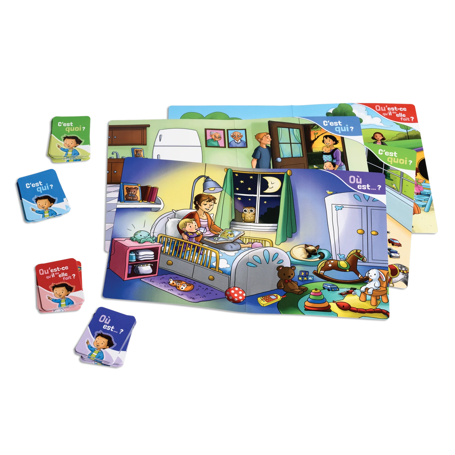 À vos marques, prêts, cherchez! Pour savoir quel objet ou quel personnage chercher, prends une carte et écoute attentivement la question de papa ou maman. Tu peux aussi partir à la recherche des objets qui sont sur les cartes «Cherche partout».