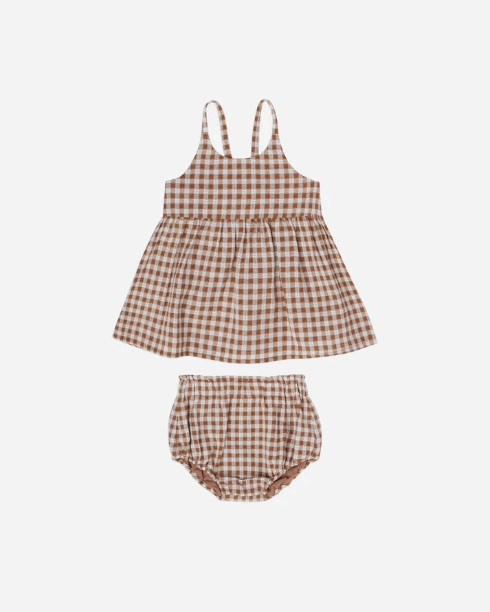 Cet ensemble comprend un joli débardeur swing avec des bretelles spaghetti et un dos élastique et un bloomer.